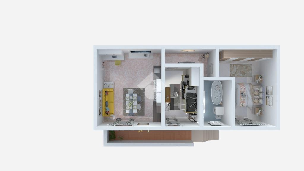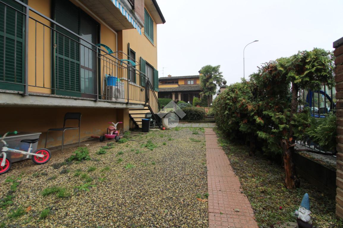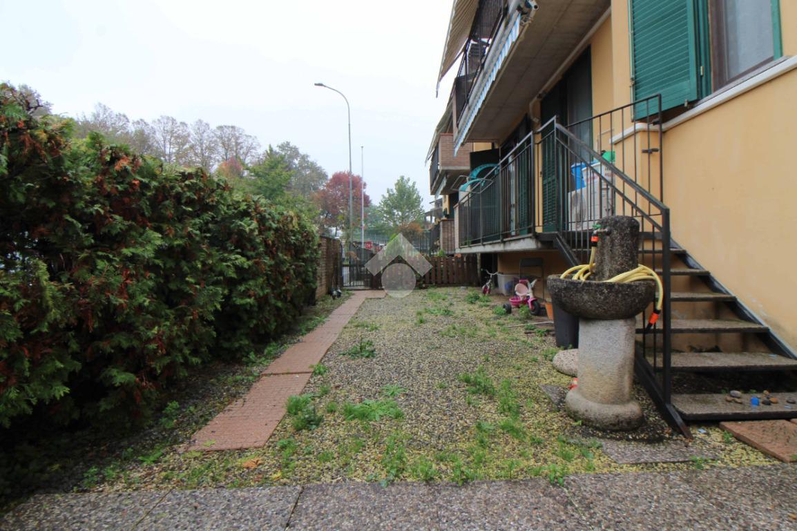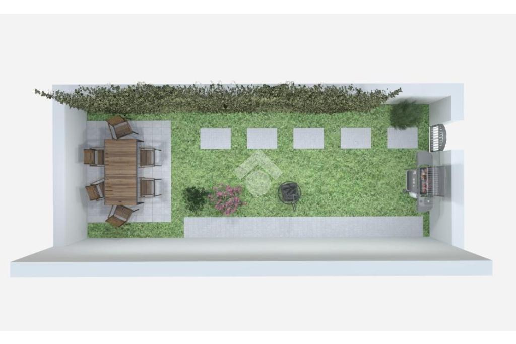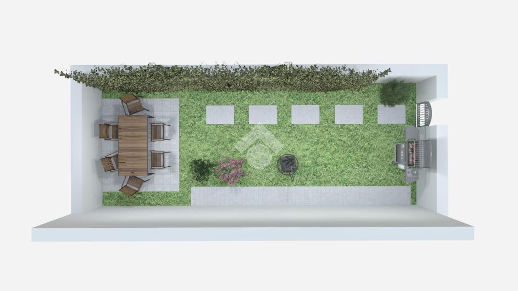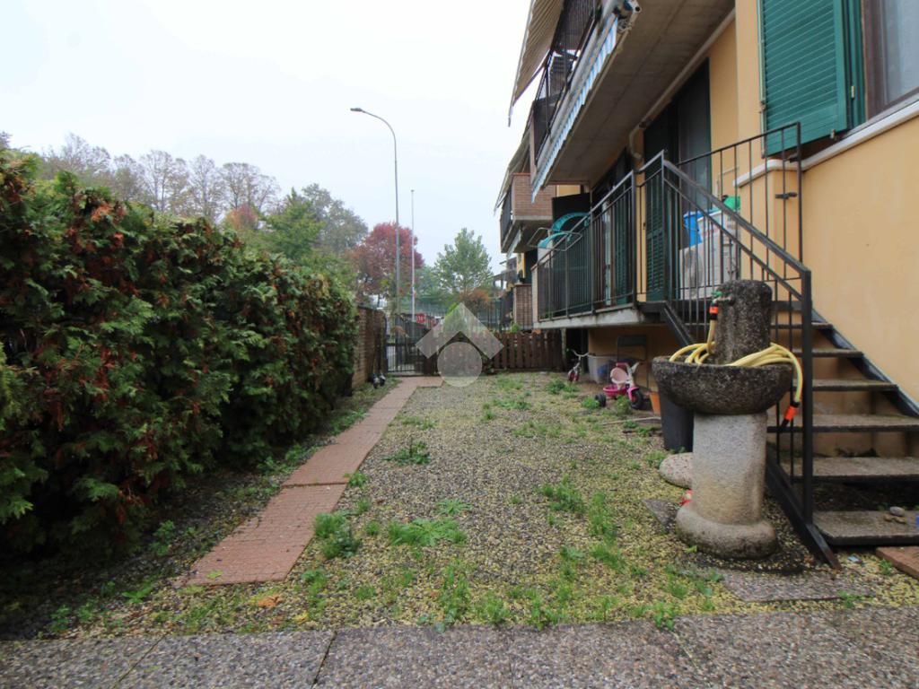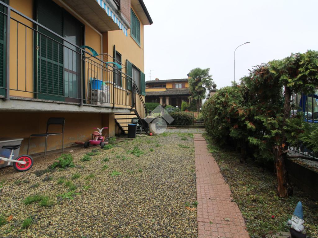Comodo appartamento al piano rialzato con balcone e giardino privato di 45 mq con ingresso indipendente. L'immobile è composto da soggiorno con cucina a vista, disimpegno e bagno con vasca. Due camere da letto e box doppio con cantina.