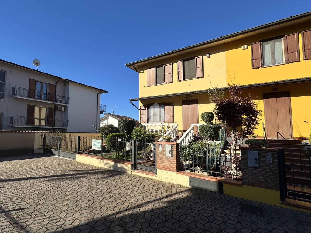 In tranquilla zona residenziale proponiamo villa a schiera libera su tre lati di comode metrature. La soluzione è composta da soggiorno, bagno con la doccia e cucina abitabile con accesso alla scala che porta al giardino privato, collegato anche alla cantina. Al piano inferiore troviamo la cantina di 65 mq tutta rifinita e con angolo lavanderia e la porta che collega al box di 32 mq. Al primo piano troviamo le tre camere da letto di cui una con balcone ed il bagno padronale con la vasca. L'immobile è completo di zanzariere, infissi nuovi in alluminio.