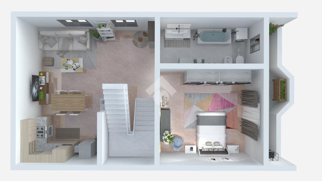 Abitazione con ingresso indipendente e giardino privato di 45 mq. una scala interna porta al primo piano dove troviamo il soggiorno con la cucina a vista ed il bagno con vasca. Camera matrimoniale con accesso diretto al balcone. Al piano superiore vi è la mansarda ideale come seconda camera con sfogo sul balcone. Box doppio al piano interrato.